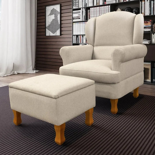 Poltrona para Amamentação Sabrina em Linho com Puff Baú e Pés de Madeira