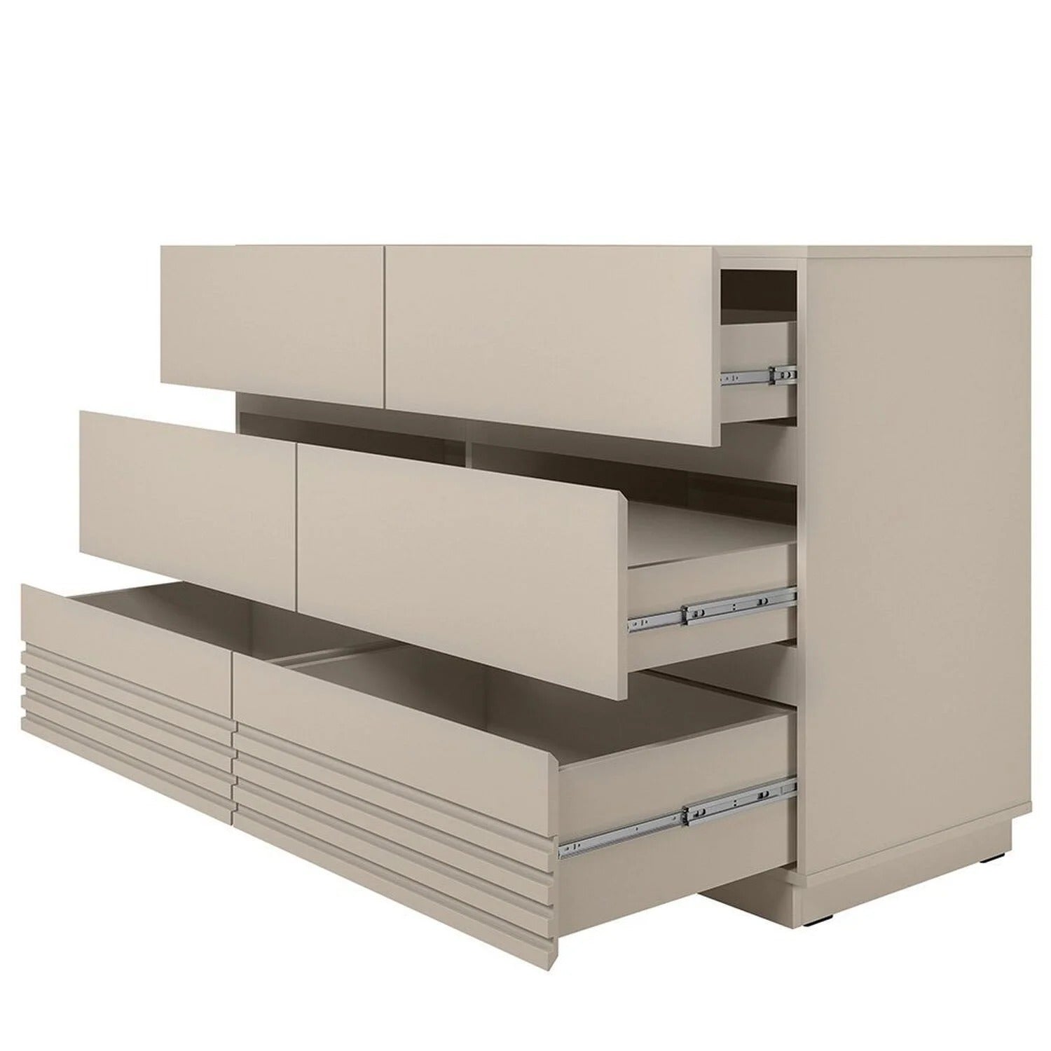 Com seis gavetas profundas, equipadas com corrediças telescópicas metálicas, o móvel oferece organização eficiente para roupas, acessórios e objetos pessoais. O acabamento em pintura UV fosca garante resistência e beleza duradoura, enquanto os puxadores embutidos valorizam o visual moderno da peça.
