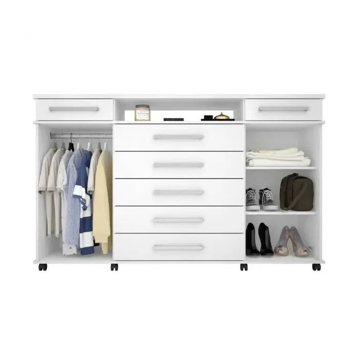 O design moderno com acabamento branco em impressão semi-brilho confere um visual clean e versátil que combina facilmente com diversos estilos de decoração. Seu interior conta com prateleiras funcionais e bastão para cabides, proporcionando ainda mais organização no dia a dia.